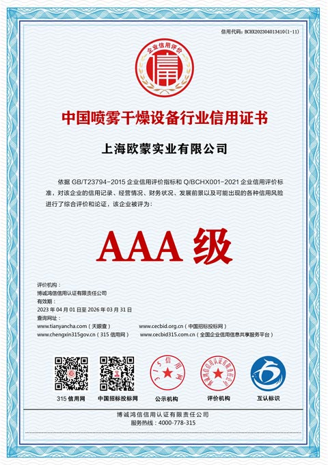 上海歐蒙實業有限公司坐落于中國“申城魔都” “東方巴黎”----上海。是一家集產品研發、設計、制造、營銷于一體的綜合企業。為客戶提供整體解決方案。 上海歐蒙****產品主要有:噴霧干燥機系列、實驗室噴霧干燥設備、干法制粒機、噴霧造粒機、沸騰制粒機、噴霧干燥制粒機、濕法混合制粒機、旋轉制粒機、單錐真空混合干燥機、雙錐回轉真空干燥機、混合機系列、蒸發蒸餾、濃縮提取系列等。